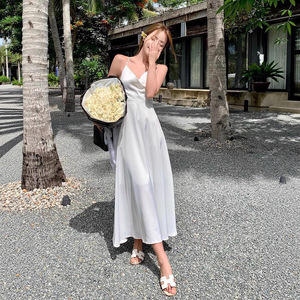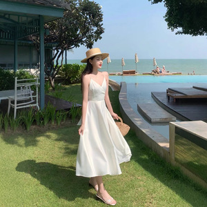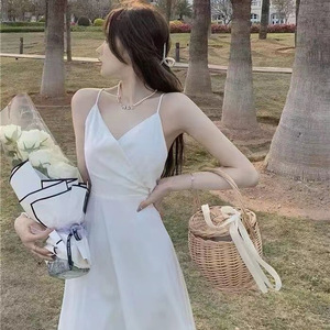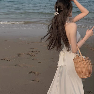 2025年夏サスペンダードレスフェミニンバックレスリボンホワイトミディスカートフレンチレトロスカート