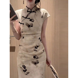 フランス風中国風水墨画ボタン付きドレス女性の夏のスタンドカラースリムフィット純粋な欲望の気質新しい中国風スリット改良
