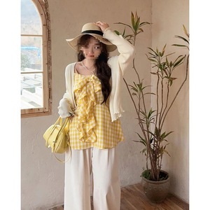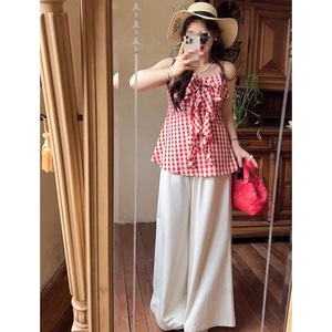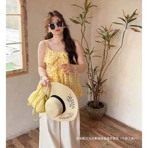 クロスボーダーデザイン甘いリボンチェック柄サスペンダーレディース大きいサイズ少し太ったmm痩身ノースリーブトップ夏