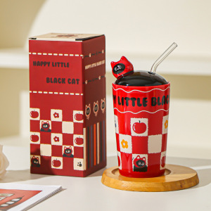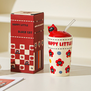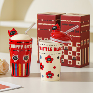 漫画の子猫のストローカップ、かわいくて見栄えの良いマグカップ、女の子用ウォーターカップ、蓋付きの大容量カップ、お土産