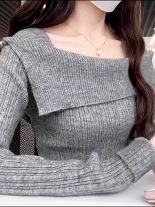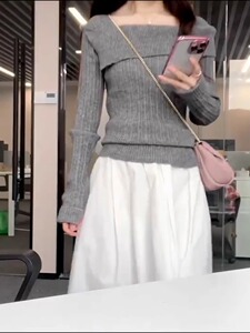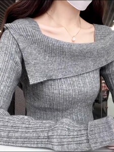 2025早春穿搭新款女法式一字肩灰色毛衣慵懒风露肩内搭针织衫上衣