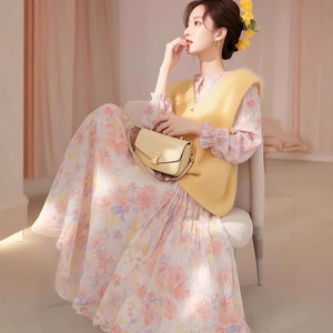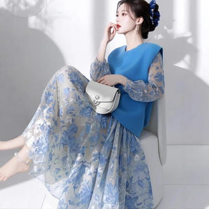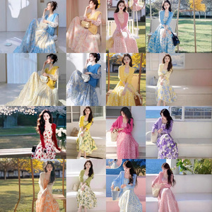 広州十三行フレンチティーブレイクウエスト痩身ドレス夏パフスリーブハイエンド韓国ロングスカート