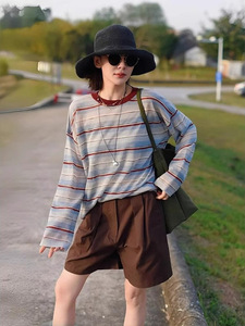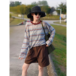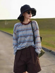 フレンチレトロストライプ長袖Tシャツレディース夏薄手ゆったりレイジーデザイン日焼け止めブラウストップ
