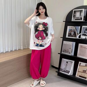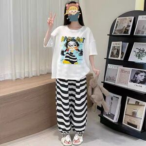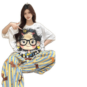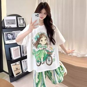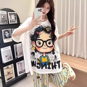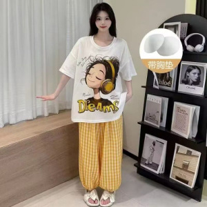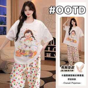 女性のための胸パッド付き人気パジャマ 2025 夏クラウドコットン半袖ズボン甘い漫画ホームウェアツーピーススーツ