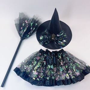 クロスボーダーハロウィンカボチャスカートスーツ魔女ほうき魔女帽子セットヨーロッパとアメリカのプリントメッシュチュチュスカートスーツ
