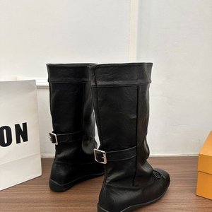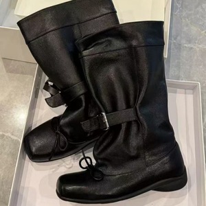 牛革バージョン~5cm以内の高さデザインバレエリボンミッドカーフブーツレディースベルトバックルスクエアトゥ気質パイルブーツ