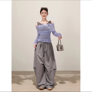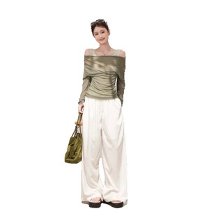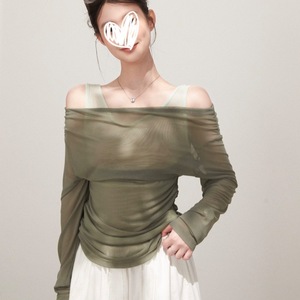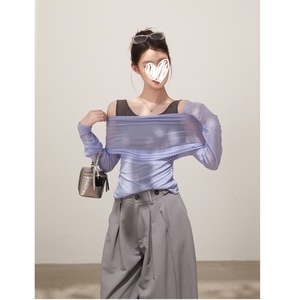 Yi Deng 2025 夏コントラストカラーステッチフェイクツーピースメッシュスリムフィットワンショルダー長袖 Tシャツレディーストップス