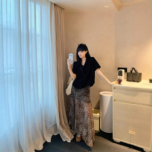リアルショット夏デザインスリットヒョウ柄スカート薄手ロングスカート+黒VネックTシャツスーツ女性用84528