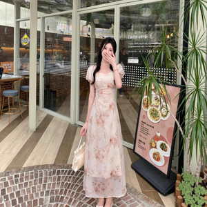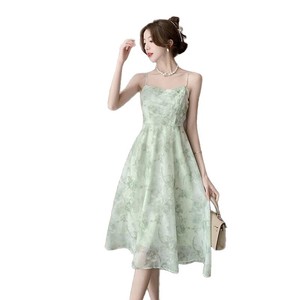 2025 新しい夏の花柄スカート女性のフレンチスタイルのチェリードレスハイエンドの新鮮なサスペンダーロングスカート夏