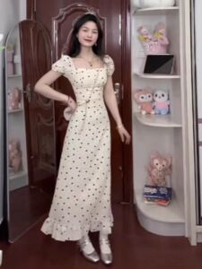 フレンチスクエアネックパフスリーブドレス女性のための 2025 夏の新しいスタイル優しい気質ティーブレイクドレスウエスト痩身ロングスカート