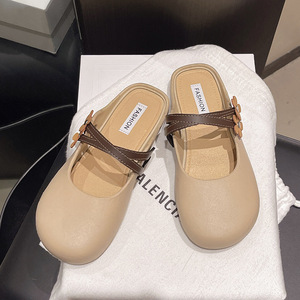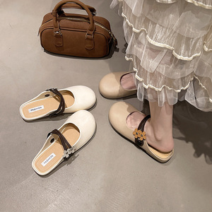 2025 新しい夏包頭ハーフスリッパ女性のアウターウェアサンダルフラットフラワーレトロソフトソールメリージェーンシューズ