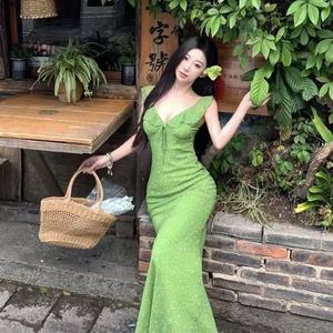温柔风修身荷叶边碎花连衣裙女法式收腰飞飞袖长裙显瘦v领吊带裙
