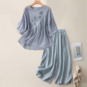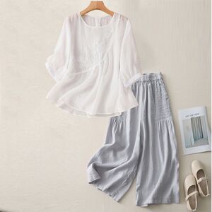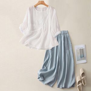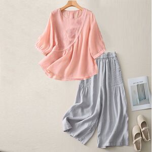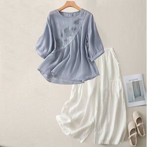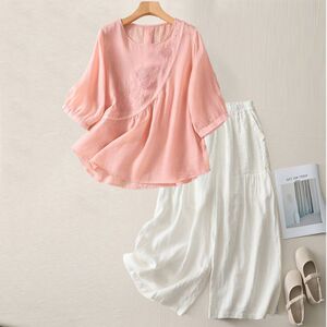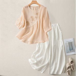 夏の新しいファッションスーツラウンドネック五分袖Tシャツ綿とリネンの刺繍アートスリムレトロルーズカジュアルパンツ