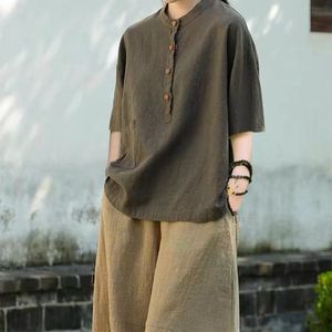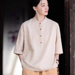 春夏季棉麻立领纯色文艺复古衬衫女纯色休闲百搭半袖半开衫纽扣女