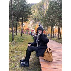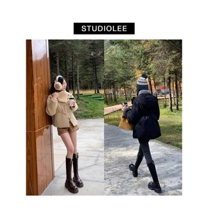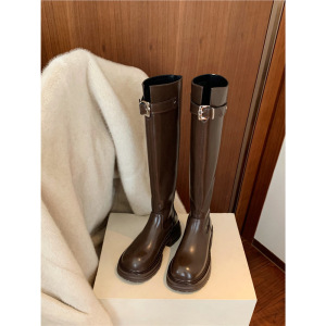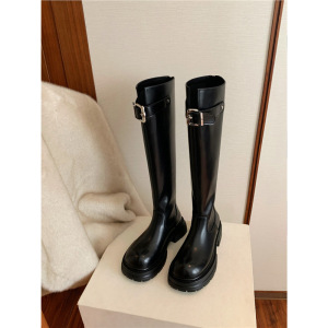 葡萄妈studiolee时髦皮带扣设计显瘦圆头粗跟中长筒骑士靴女新款