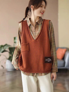 レトロラベルベストニットベスト女性の 2025 秋の新 V ネックルーズカジュアルプルオーバーニットベスト