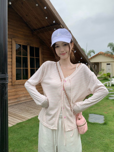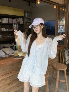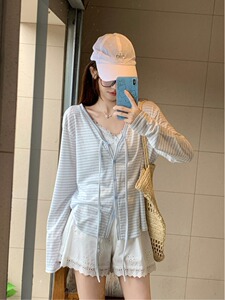 テンセルスノーフレークストライプカーディガンジャケット女性のための夏の 2025 新しいルーズスリム V ネックレース日焼け止めトップトレンディ