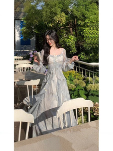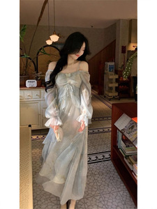 大码绝美紫色晕染烫金连衣裙女春季胖mm一字肩荷叶边仙气长袖裙子