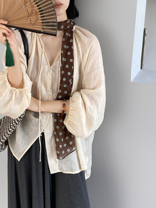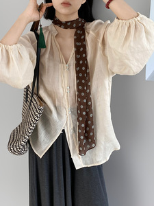 Jiangzuo 100 ラミー禅スタイル日焼け止めシャツ女性の夏フレンチルーズ薄型ランタンスリーブトップ 1565