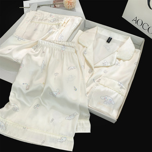 胸パッド付きアイスシルクパジャマ 3 点セット女性漫画シナモンドッグホットシルバー KT 猫半袖アイスシルクホーム服夏薄い
