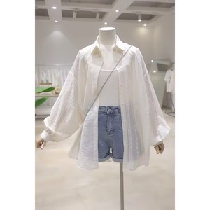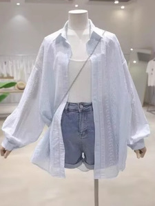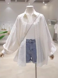 テンセルコットンテクスチャード日焼け止めシャツ女性の夏の小さなルーズカジュアル微透け長袖シャツジャケットトップ