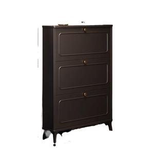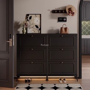 玄関ドアの外の廊下に設置された黒い無垢材の靴キャビネット、屋内用の非常に狭いダンプカート、壁に一体型の収納キャビネット