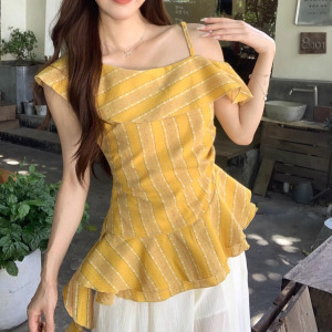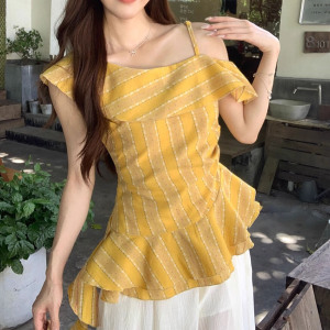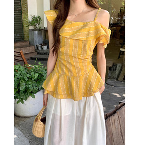 女性用のユニークで美しい斜め肩のノースリーブトップ、見栄えの良い高級サスペンダーアウターウェア、夏用の不規則なフリルシャツ