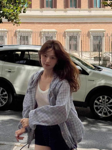 スポット韓国デザイナー ged Hejing 同じスタイルのチェック柄フード付きシャツ韓国女性のカレッジスタイルのルーズシャツ