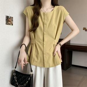 夏の新しいファッション、多用途で気質のあるフレンチプリーツ半袖シャツ、ウエストを細くし、肉をカバーし、スリムに見せるトップス、多用途