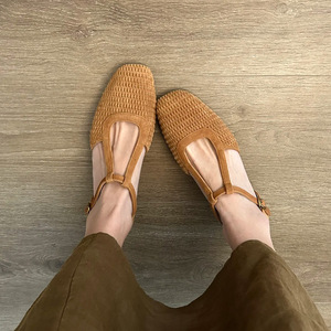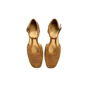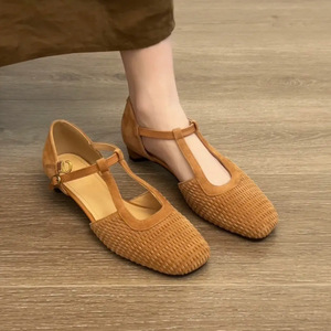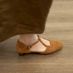シープスキンバージョン~レトロ織りスクエアトゥローマンサンダルホリデースタイルレディース中空ワンラインバックルストラップ太いヒール本革つま先