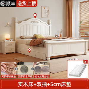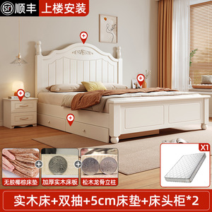 無垢材ベッド + ダブル引き出し + 5cmマットレス + ベッドサイドテーブル*2 【ご自宅への無料配送】