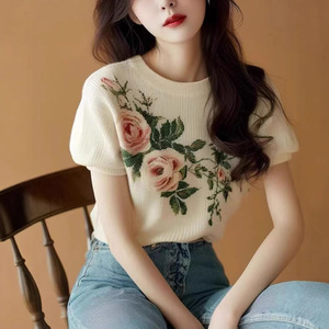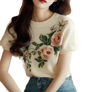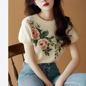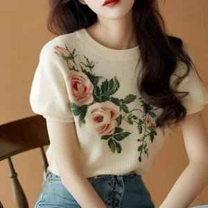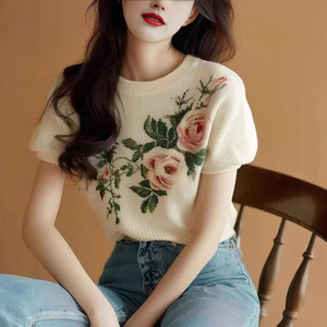 2025 ホットスタイルレトロエレガントなスタイルローズプリントニット半袖 Tシャツ女性の甘い気質トップランタンスリーブ夏