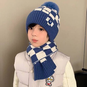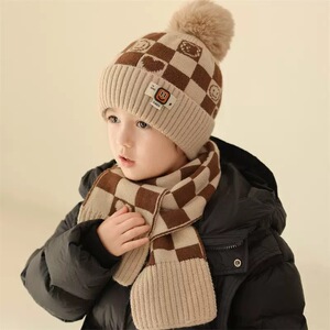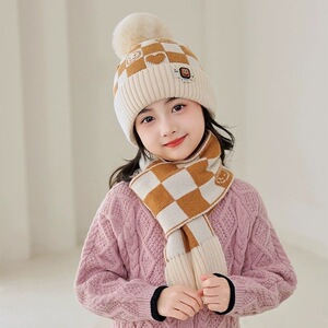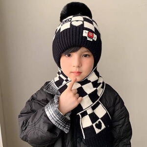 新しいジャカードスマイリーチェック柄ウール帽子スカーフツーピーススーツ冬子供用暖かい毛玉ニット帽子厚みのある