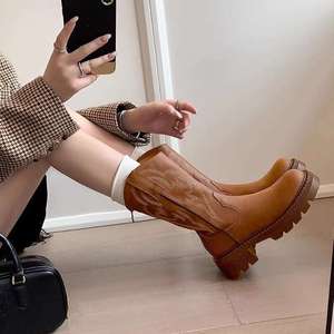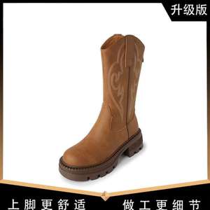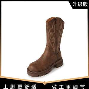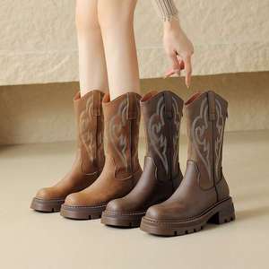 2025 秋冬新レトロブラウン厚底刺繍ウエスタンカウボーイブーツ小川西旅行ミッドカーフブーツ女性用