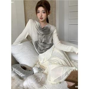 2024秋季新品韩版百搭显瘦气质花边垂感不规则松紧腰丝绒短裙女