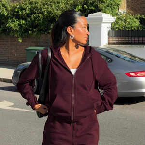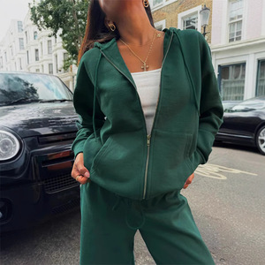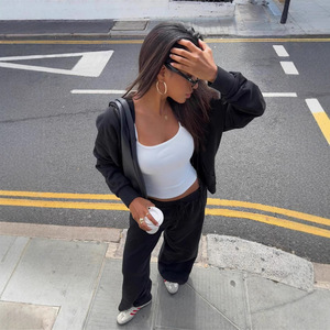 跨境外贸欧美街头风休闲套装纯色长袖拉链开衫外套系带长裤二件套