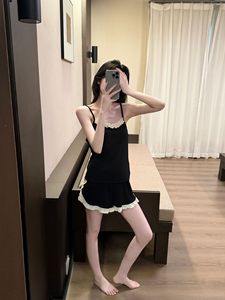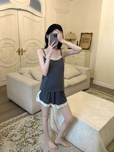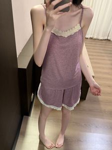 女性用パジャマ、胸パッド付き夏用サスペンダーショーツ、レース、シンプルな無地、女の子用ホームウェア、ツーピースセット、通気性があり快適