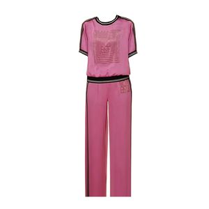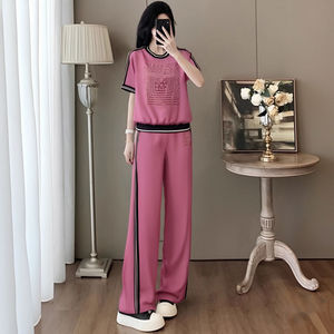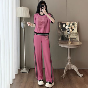 ローズピンクのファッションスーツ 2025 女性の夏の新しいデザインプリント半袖ファッションストレートパンツの完全なセット