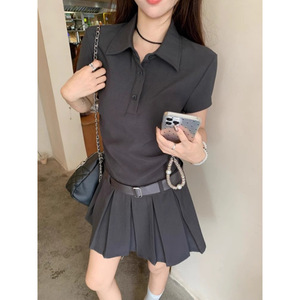 フレンチアメリカングレーポロカラー半袖Tシャツドレス夏の女性の小柄なスリムAラインプリーツスカート