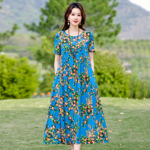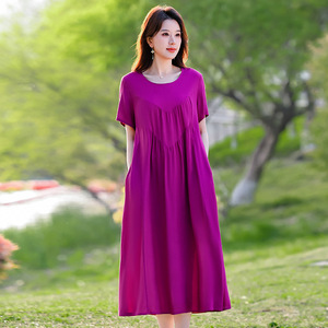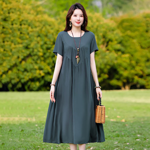 2025年新作大きいサイズのコットンシルクドレス、新しいアウターウェア、若いスタイル、ゆったりとしたお腹カバー、高級人工綿ロングスカート