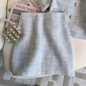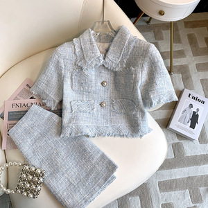 小香风套装裙夏季女浅蓝色短袖法式上衣纯欲风小众设计感两件套
