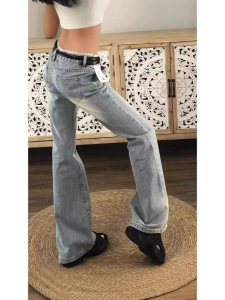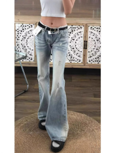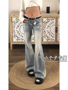 145小个子蕾丝花边拼接微喇牛仔裤女美式高街低腰修身显瘦拖地裤