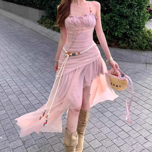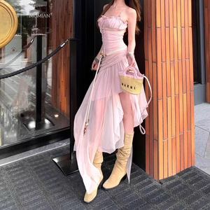 甜辣重工网纱拼接吊带连衣裙女2025夏季新款收腰显瘦不规则A字裙
