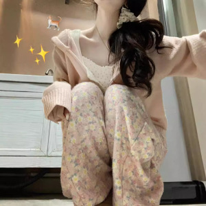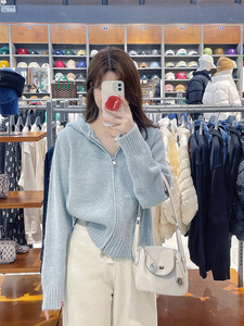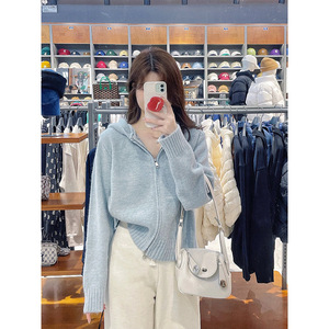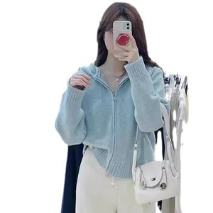 女性のためのブルーの優しいフード付きニットカーディガン春と秋のフレンチソフトワックスのような怠惰なスタイルのセータージャケットルーズショートトップ