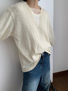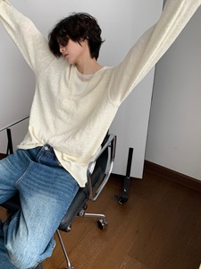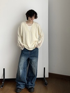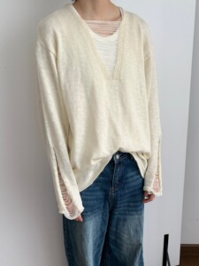 美式镂空深V设计长袖针织衫潮男夏季高级感痞帅T恤慵懒风男模上衣