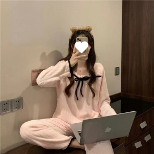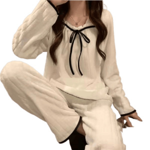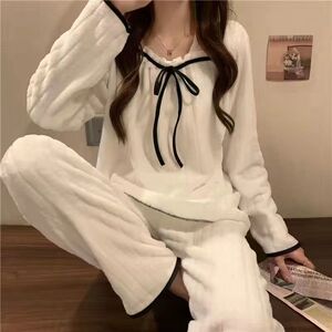 秋と冬の女性用コーラルベルベットパジャマ、厚くて甘い、年齢を軽減する長袖トップス、長ズボン、ホームウェア、直販