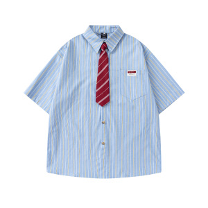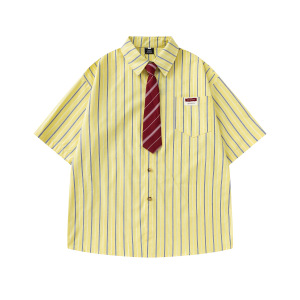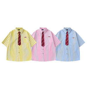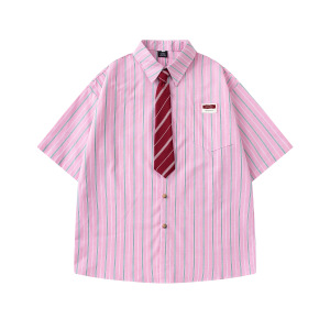 アメリカンレトロストライプネクタイ半袖シャツメンズ 2025 夏ルーズカレッジスタイルカジュアルカップルシャツジャケット