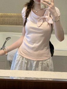 TheDouerr ウサギ耳 かわいい半袖Tシャツ 3色 夏 スリムフィット 右肩トップス 着痩せ