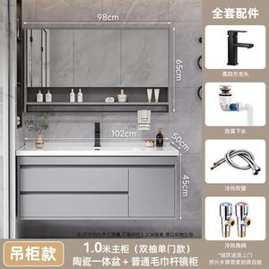 アップグレードされた[タオルバー]シルバーグレーの普通のミラーキャビネットスタイルウォールキャビネット-100cm+セラミック洗面器+ハードウェアアクセサリー[取り付け込み]-