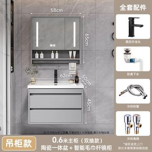 アップグレードされた[タオルバー]シルバーグレースマートミラーキャビネットスタイルウォールキャビネット-60cm+セラミック洗面器+ハードウェアアクセサリー[取り付けなし]-